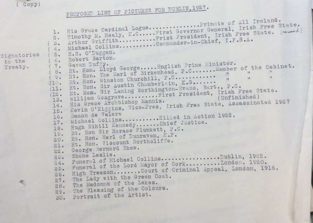 The gift also included portraits of the British signatories to the Treaty and Lavery took exception to a report ‘that [his] gift would be an embarrassing one, based on the fact that it included portraits of persons who might be regarded as unpopular in this country e.g. “F E Smith” (now Lord Birkenhead)’. Political anxieties and artistic temperament led to a delay in the presentation of the gift until 1935 by which time, some of the paintings offered in 1927, such as Cardinal Logue (1920), The Lady with the Green Coat (1926) and a 1927 self-portrait, were no longer on offer.
